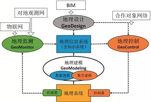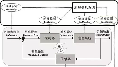 地理建模、地理監(jiān)測(cè)最終要為地理設(shè)計(jì)和地理控制服務(wù),地理設(shè)計(jì)為地理控制設(shè)定控制的目標(biāo),地理控制確保目標(biāo)的達(dá)成。大地理學(xué)基于地理信息系統(tǒng)對(duì)現(xiàn)實(shí)的地理系統(tǒng)的調(diào)控機(jī)制如下圖所示,形成一種賽博-物理系統(tǒng)構(gòu)成的閉環(huán)控制體系,這種體系可以是多層次分布體系,通過(guò)信息總線實(shí)現(xiàn)系統(tǒng)的整體和分布式調(diào)控。