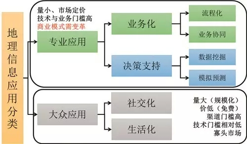 大眾應(yīng)用的復(fù)雜度(專業(yè)化程度)相對(duì)較低、用戶量大,價(jià)格敏感,渠道門檻高,主要由互聯(lián)網(wǎng)巨頭主導(dǎo),以互聯(lián)網(wǎng)地圖平臺(tái)為核心,逐步形成了互聯(lián)網(wǎng)地圖應(yīng)用生態(tài)系統(tǒng),帶動(dòng)第三方應(yīng)用(如APP)的發(fā)展,并滲透到企業(yè)和政府應(yīng)用,如微信和打車軟件的地圖應(yīng)用。隨著應(yīng)用的深入,應(yīng)用復(fù)雜度也在增加,但仍以公眾需求為核心。目前,互聯(lián)網(wǎng)巨頭主導(dǎo)的這種互聯(lián)網(wǎng)地圖發(fā)展和應(yīng)用模式已開始影響專業(yè)應(yīng)用。