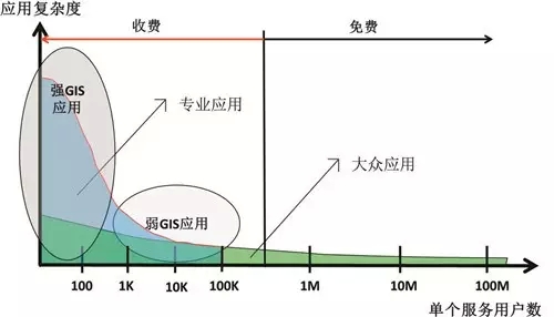 GIS應(yīng)用復(fù)雜度與用戶數(shù)及收費(fèi)模式的關(guān)系如圖5。