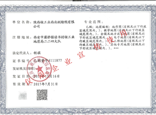 12月16日,陜核西北測繪院順利通過了陜西省測繪地理信息局行業(yè)管理處審核,取得了地圖編制乙級資質(zhì)。此項(xiàng)資質(zhì)的業(yè)務(wù)范圍包括省級及以下行政區(qū)域范圍內(nèi)地形圖、教學(xué)地圖、全國及地方政區(qū)地圖、電子地圖、真三維地圖以及其它專業(yè)地圖的編制。