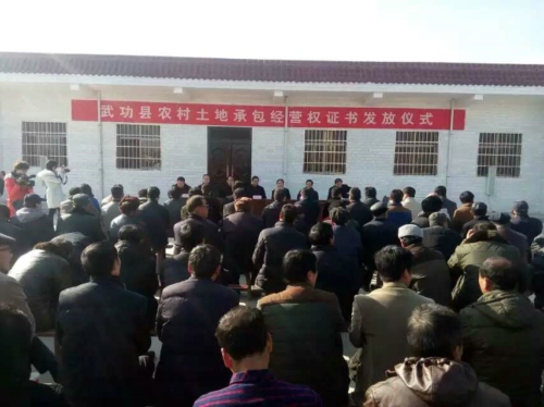 12月26日,武功縣農(nóng)村土地承包經(jīng)營(yíng)權(quán)確權(quán)登記頒證首發(fā)儀式在蘇坊鎮(zhèn)瓦子腰村舉行??h確權(quán)登記頒證工作相關(guān)單位項(xiàng)目負(fù)責(zé)人、陜核西北測(cè)繪院武功項(xiàng)目負(fù)責(zé)人殷文華以及瓦子腰村村民群眾等共計(jì)100多人參加了儀式。咸陽市政府、武功縣委、縣政府領(lǐng)導(dǎo)及相關(guān)單位負(fù)責(zé)人出席了儀式。