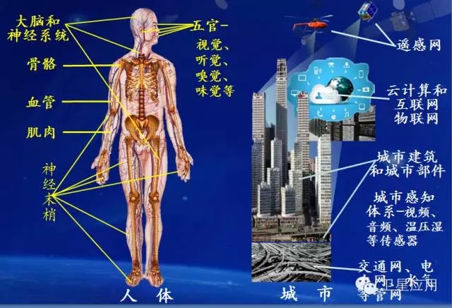 智慧城市在當(dāng)下還主要是一種發(fā)展愿景,是一個戰(zhàn)略思想。城市的智慧化,是一個巨大的科技、工程和生態(tài)體系。人為什么會有智慧?首先必須有眼、耳、鼻、這些感官(在很大程度上具有遙感的功能)外,還有分布在人體全身各個部位上超過十億(109)個感知細(xì)胞或神經(jīng)末梢,它們無時無刻不在感知或收集著來自各方的信息,這些信息經(jīng)人體的神經(jīng)系統(tǒng)傳輸至大腦(處理中心),經(jīng)大腦分析并做出決策的信息在經(jīng)神經(jīng)系統(tǒng)傳遞到人體的相關(guān)肌肉、骨骼、臟器等來執(zhí)行。這一系統(tǒng)是相互緊密連接的、是自我學(xué)習(xí)、自我完善的,這就是知識的積累過程,即人的一生也是集聚知識或智慧的一生。