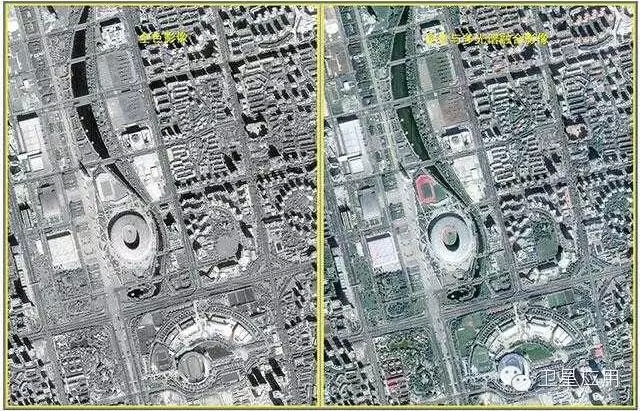 圖7 吉林一號第一幅光學(xué)影像——北京奧運公園(左圖為全色影像,右圖為全色與多光譜融合影像)