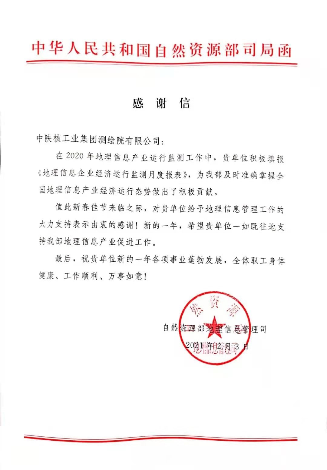 2021年3月15日,中陜核測(cè)繪院收到了一份來自中國自然資源部的感謝信,用于感謝中陜核測(cè)繪院在全國地理信息產(chǎn)業(yè)經(jīng)濟(jì)運(yùn)行態(tài)勢(shì)中做出的積極貢獻(xiàn)。