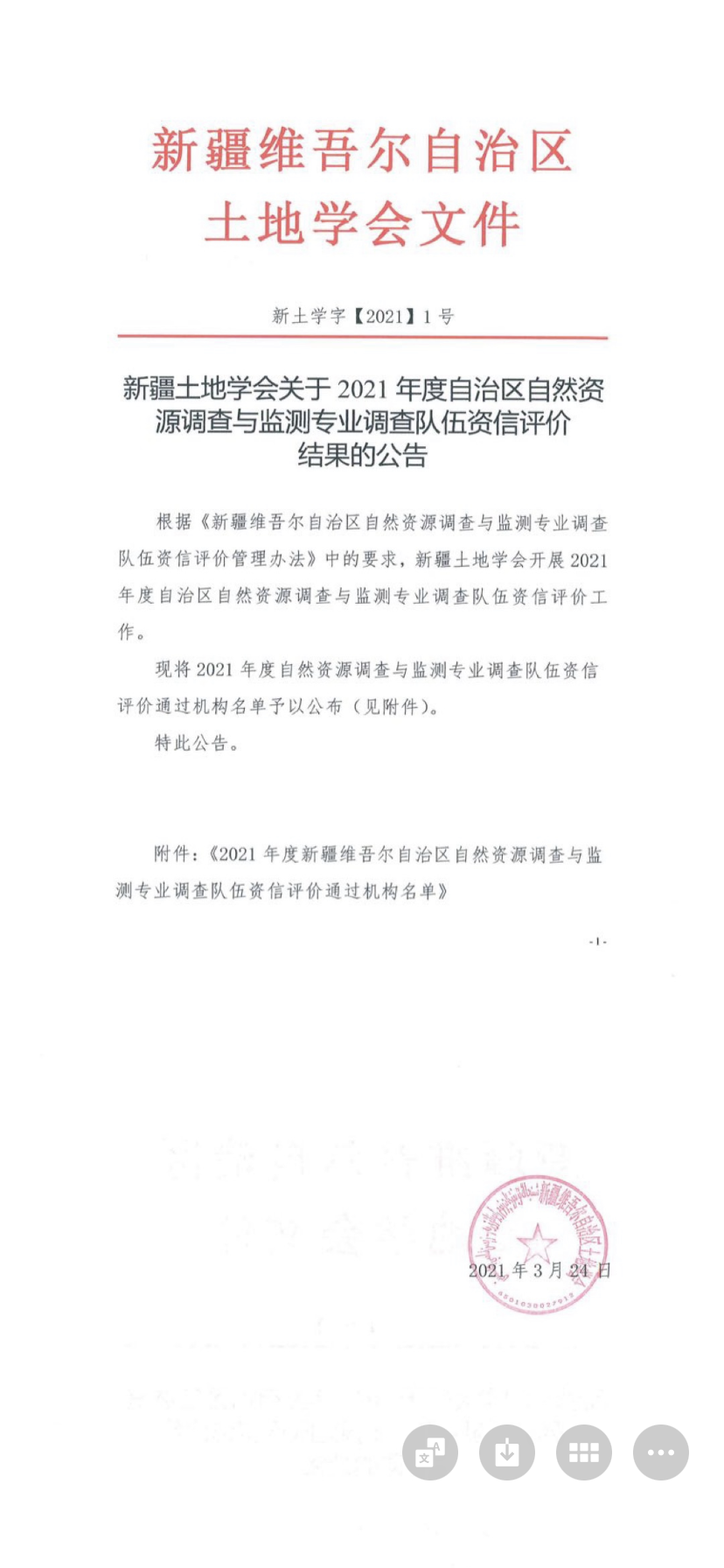 近日,新疆維吾爾自治區(qū)土地學(xué)會2021年3月24日公告發(fā)布,在新疆土地學(xué)會組織開展的2021年度自治區(qū)自然資源調(diào)查與監(jiān)測專業(yè)調(diào)查隊(duì)伍資信評價中,中陜核工業(yè)集團(tuán)測繪院有限公司新疆分公司順利通過評審。