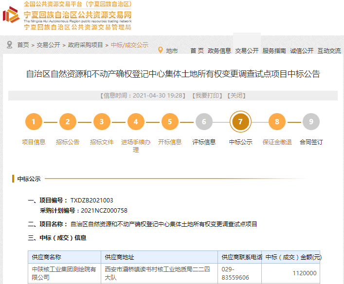 近日從寧夏回族自治區(qū)公共交資源交易網(wǎng)獲悉,中陜核測繪院以112萬元的價(jià)格中標(biāo)自治區(qū)自然資源和不動(dòng)產(chǎn)確權(quán)登記中心集體土地所有權(quán)變更調(diào)查試點(diǎn)項(xiàng)目(一標(biāo)段)。